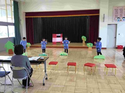 子どもたちは、少しドキドキしながらも、友達や先生と劇遊びや歌、こままわし、けん玉に取り組む様子を参観していただきました。