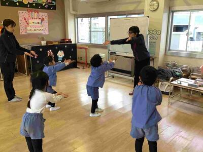 講師の先生をお招きし、より楽しい劇遊びになるように、予行(園内研究会)をしました。