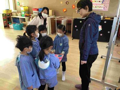 5歳児は2年間、4歳児は1年間、楽しい英語の遊びをしていただいた講師の先生に「ありがとうございました。Thanks you」と、お礼を言いました。