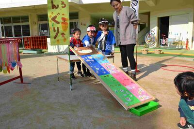 年長組はくぎ打ちをして作ったのどんぐりころころのゲーム屋さん。