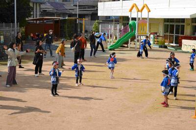 そして年長組のだんじりの練りまわしでは、「ソーレ」の掛け声もに「エンヤサ「エンヤサ」」と出発です。