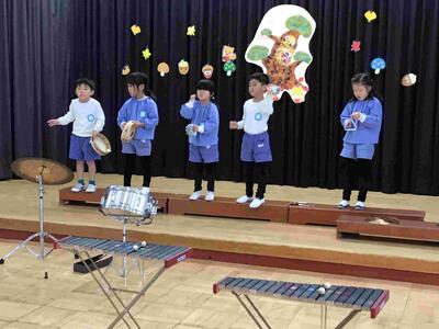 音楽の秋♪ 投稿: ルーム管理者 (14:42) 2階の遊戯室から、楽器の音色が聞こえてきました。 音楽に誘われて覗いてみると、年長組が合奏をしていました。 ピアノの音と、楽器の音がなかよしになるように、先生の指揮をみながら、楽器を鳴らしていました。 年長組は、木琴、スタンドシンバル、小太鼓、鍵盤ハーモニカ等、様々な楽器の演奏を楽しんでいます。 Tweet -