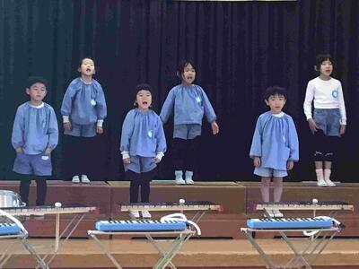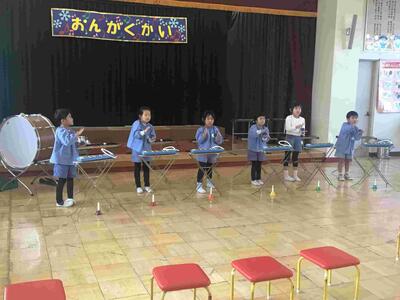 年長組は、鍵盤ハーモニカや木琴、スズ、トライアングル、シンバル、大太鼓、小太鼓など、様々な楽器を曲に合わせながら替えて合奏を楽しんでいます。