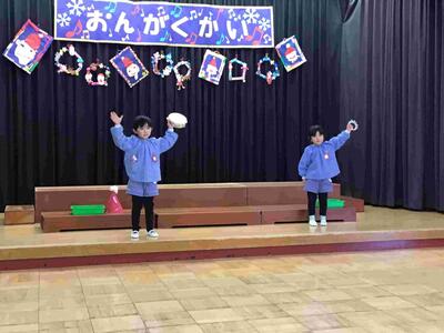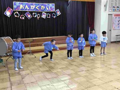 最初に、6日土曜日の音楽参観日の時に披露した楽器遊びと歌を小さいお友達に見てもらいました。