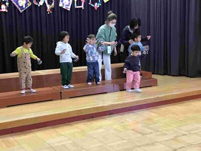 その後、小さいお友達も舞台に上がって「赤鼻のトナカイ」の曲に合わせてスズを鳴らしました。