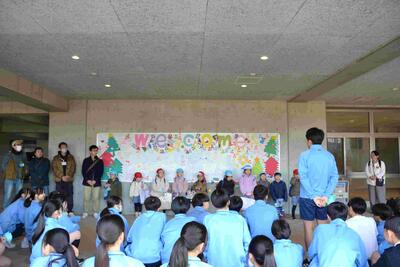 中学校の門を入ると、中学生がアーチをつくってくれてお迎え。クリスマスにちなんだ素敵なウエルカムボードも