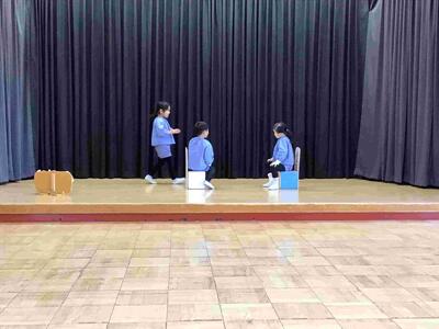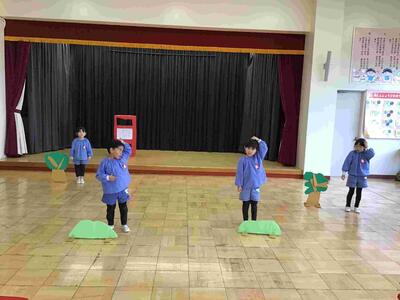 年長組は、モグラやネズミのおばあさん、親指姫、3者の関わりを、動きやセリフを考えながら遊んでいました。