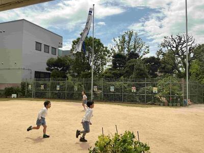 最初は少し元気がなかったのですが、年長児が「風を起こそう!」と庭を走ると、そこに年少児も加わました。