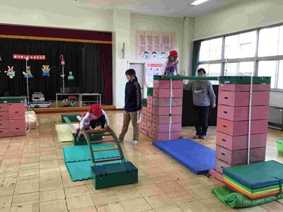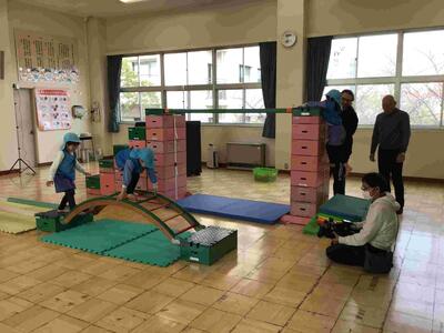 巧技台では、友達がチャレンジしている様子を見て刺激を受け、自分も!と思いチャレンジしていました。