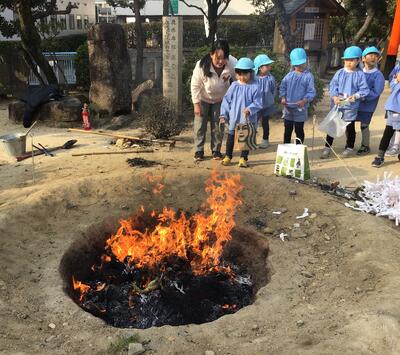 また、お隣りの打出天神社のとんどに行きました。神社の方から「お正月飾りや書初め等を燃やして、無病息災を願いお祭りです」というお話をお聞きしました。