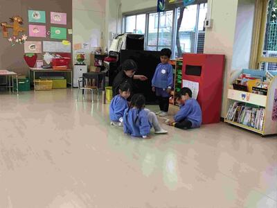 年少組は、さるくんが、「歯が治るくすりをください」と、じどうはんばいきにお願いする場面を遊んでいました。