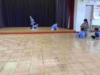 今回は、小槌幼稚園の子どもたちが大好きなリズムステップ「うしろけり」を見てもらい、夢咲のお友達も一緒にしました。