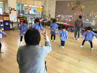 毎朝行っている耐寒遊びの「こづちっ子パワータイム」に、代休日の小学生や保護者の方、園児の妹弟たちも参加しました。今週の体操は「ラーメン体操」です。